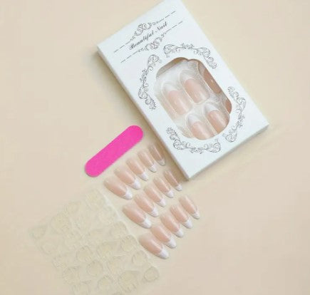 Timeless and refined, these almond-shaped press-ons feature a glossy nude base and crisp white tips—perfect for a polished, everyday look or a special occasion. Delicate and natural-looking, these press-ons deliver the ultimate nude-and-white combo with salon-quality shine and a flawless finish.